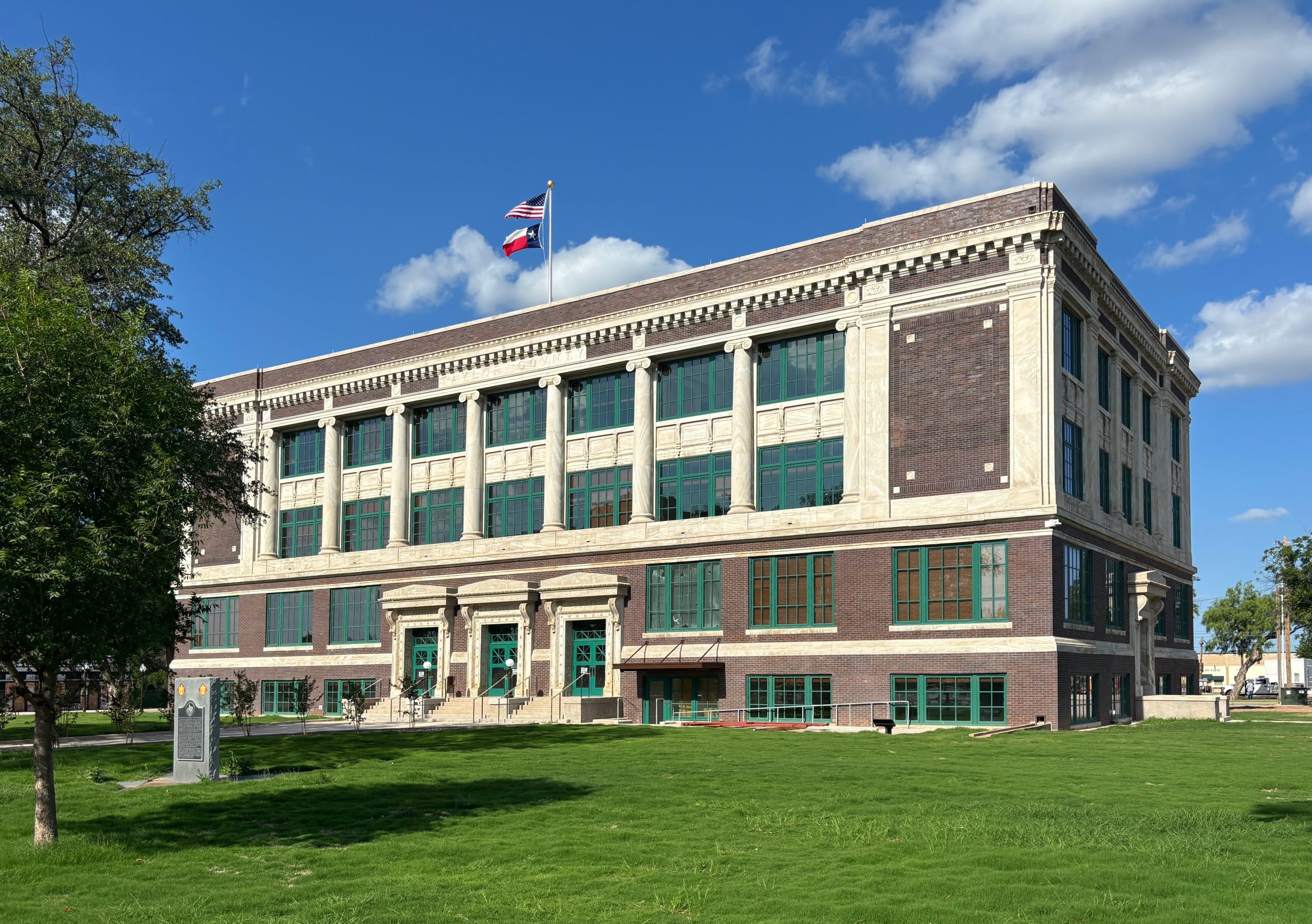 The 1915 Taylor County Courthouse was designed by Waco architect George Burnett. The three story, 40,000 square-foot county capitol is an excellent example of Classical Revival architecture, evident in its well-balanced, symmetrical facades, colossal columns, classical details, and use of brick and stone to create a sense of permanence and grandeur.