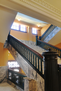 Interior and exterior staining and painting was completed to match historic colors, including a vibrant green accent on the monumental stair railings. Finally, the reconstruction of courtroom furnishings and dividing rails was completed to closely match the historic design.
